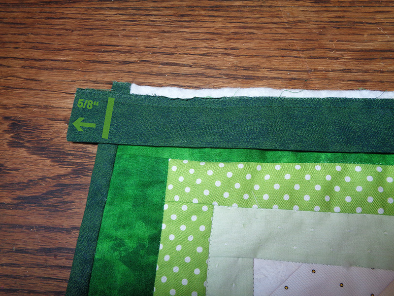 34. Add 1 ¼” to wrap around the raw edges on either side. Mark a generous 5/8” from the top of the folded binding piece. This should fall precisely where it will meet the edge of the side binding. Pin, stitch with ¼” seam as before.