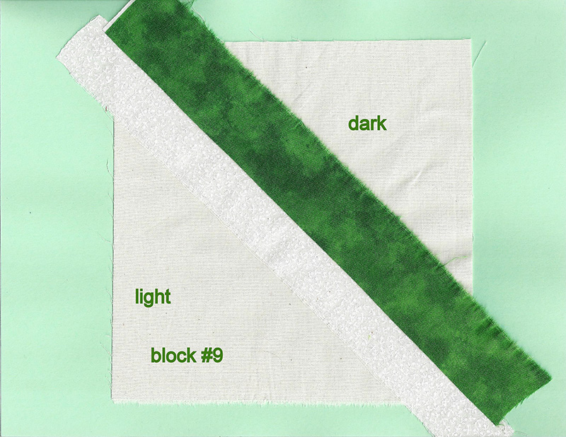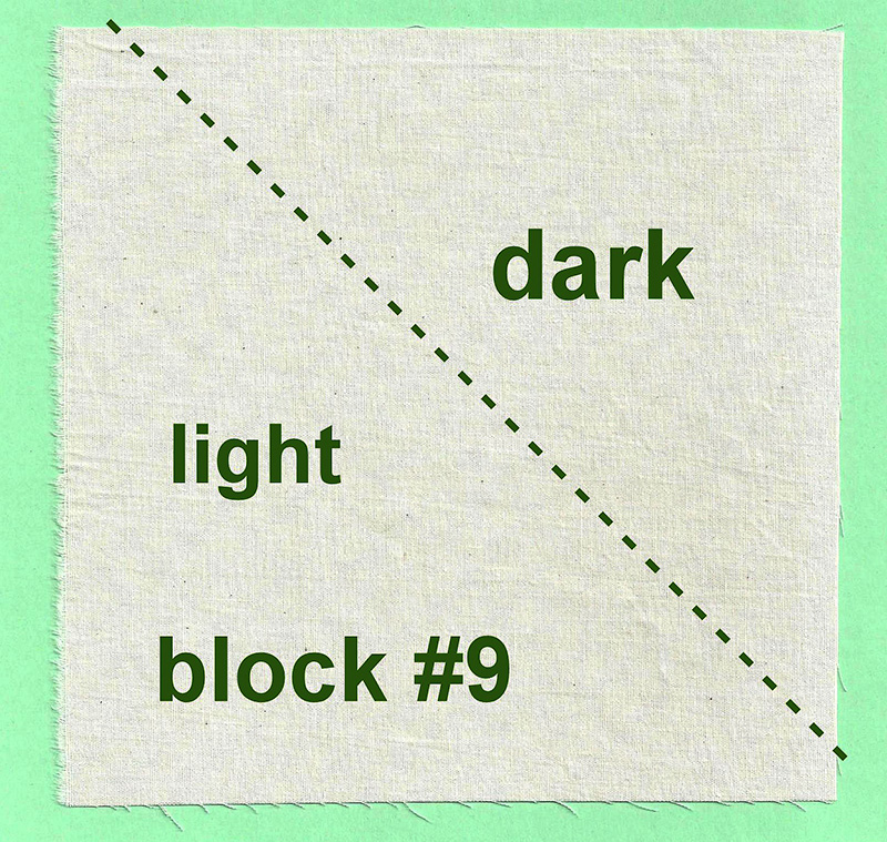 1. Draw a line ¼” from diagonal center on the first and each subsequent 7” square. With a pencil, lightly mark each side of the line as dark or light. Then record the block number on the right and wrong side.