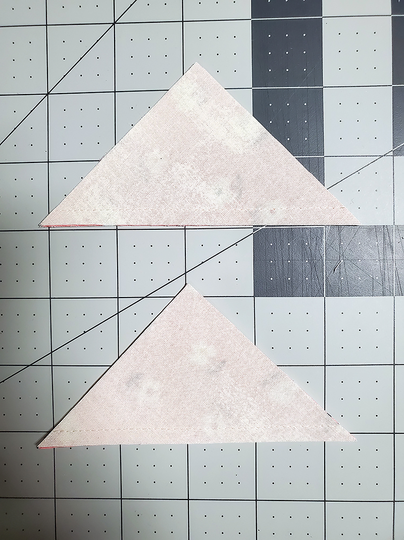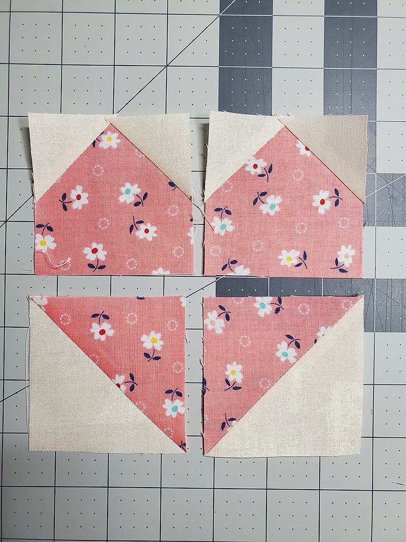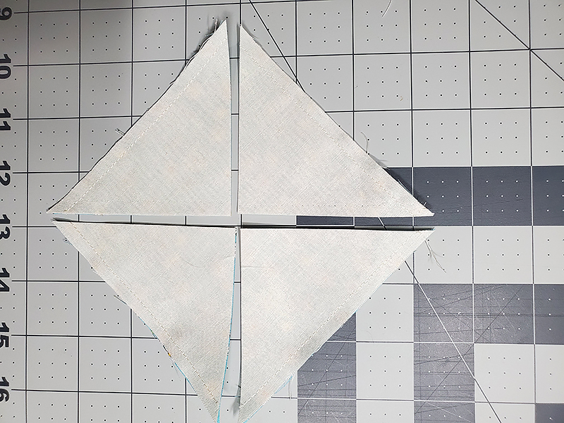 3. Cut the squares sewn in Step One and Step Two diagonally twice producing EIGHT ½-square triangles. (You only need SIX for the top of your apron bib.)