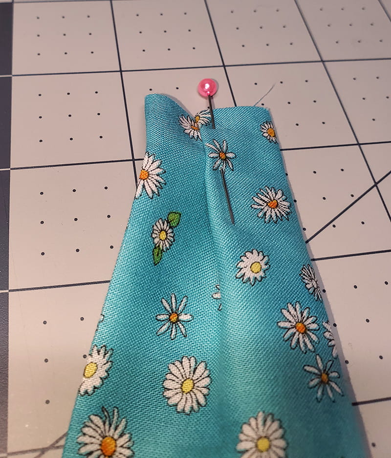 44. Fold a pleat on the open end of one of the ties made in Part Six. Pin in place.