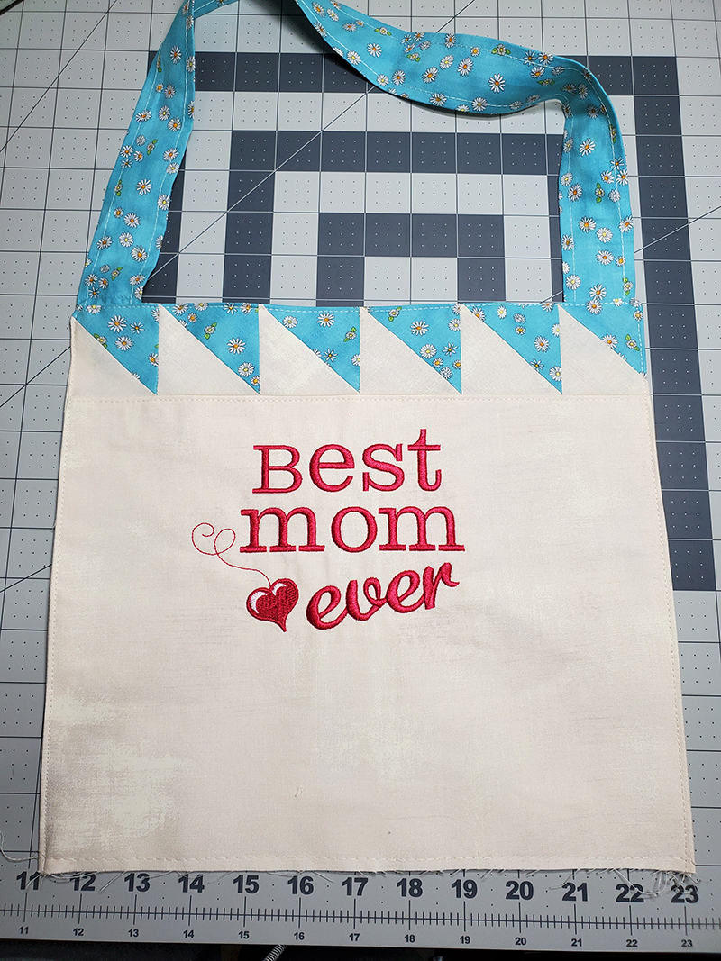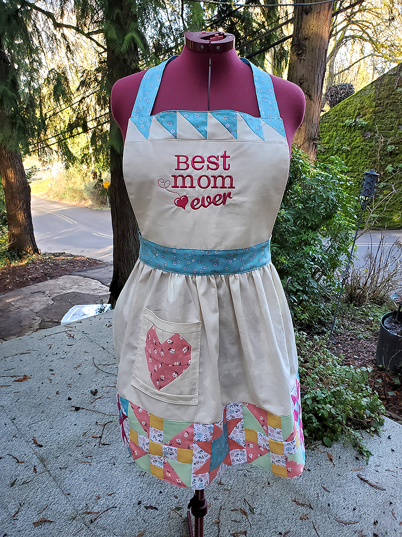 Show Mom how much you love her with this embroidered Apron. Pieced quilt block instructions are included, or, you can use those orphan quilt blocks from other projects.
