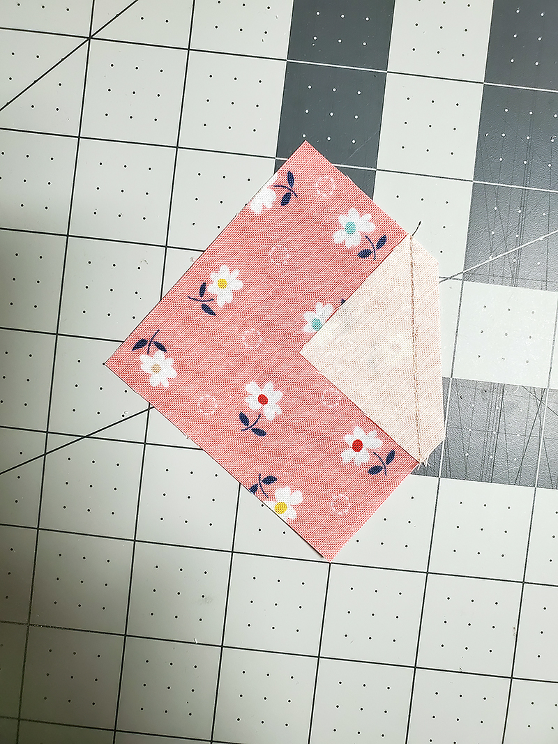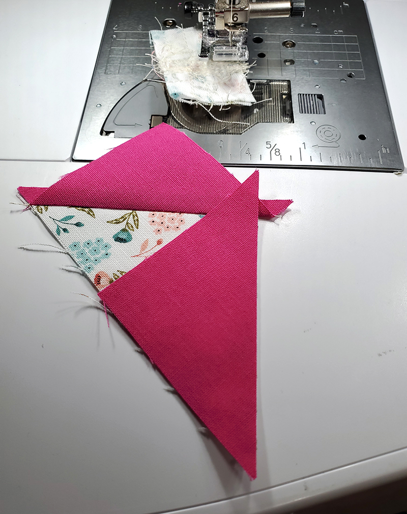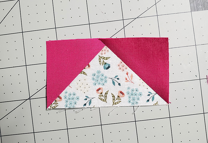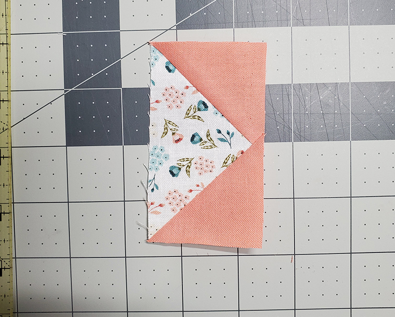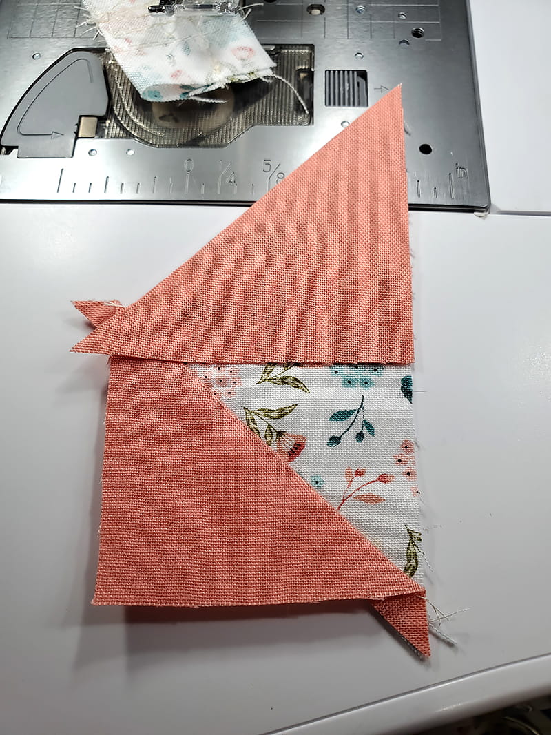 6. With RST, stitch one unit from Step Two to one unit from Step Four. Press seam toward half square triangle unit.