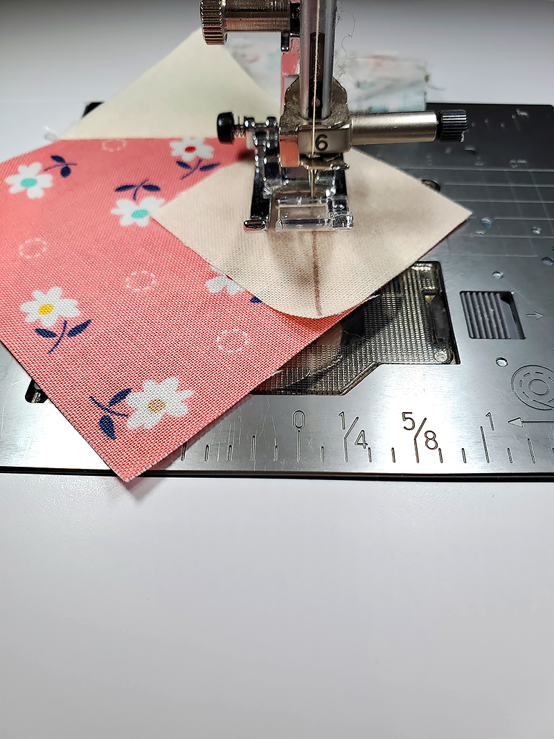 4. Matching RST, line up one “I” square with the top left corner of one “W” square. Sew on the diagonal line you drew in Step Three. Trim seam allowance to 1/4.”