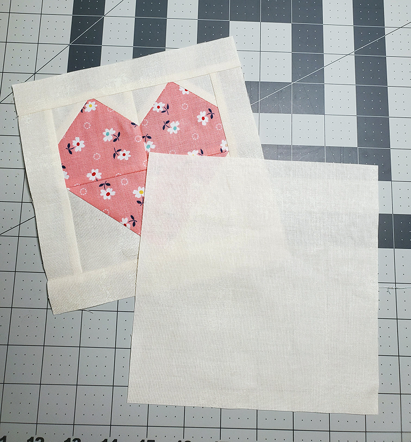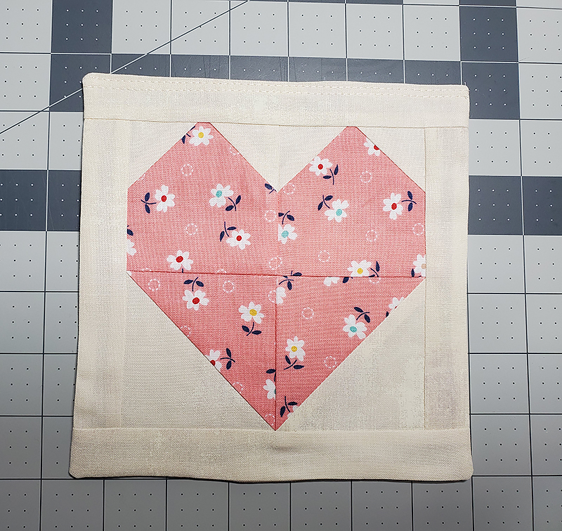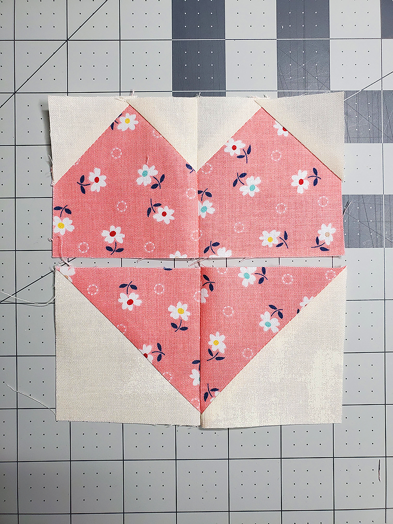 9. Nesting the seams, stitch units from Step Seven and Step Eight together, RST. Press seam OPEN. Heart should measure 5 ½” square. Trim to size if necessary.