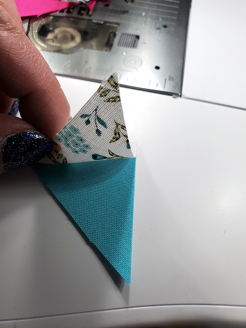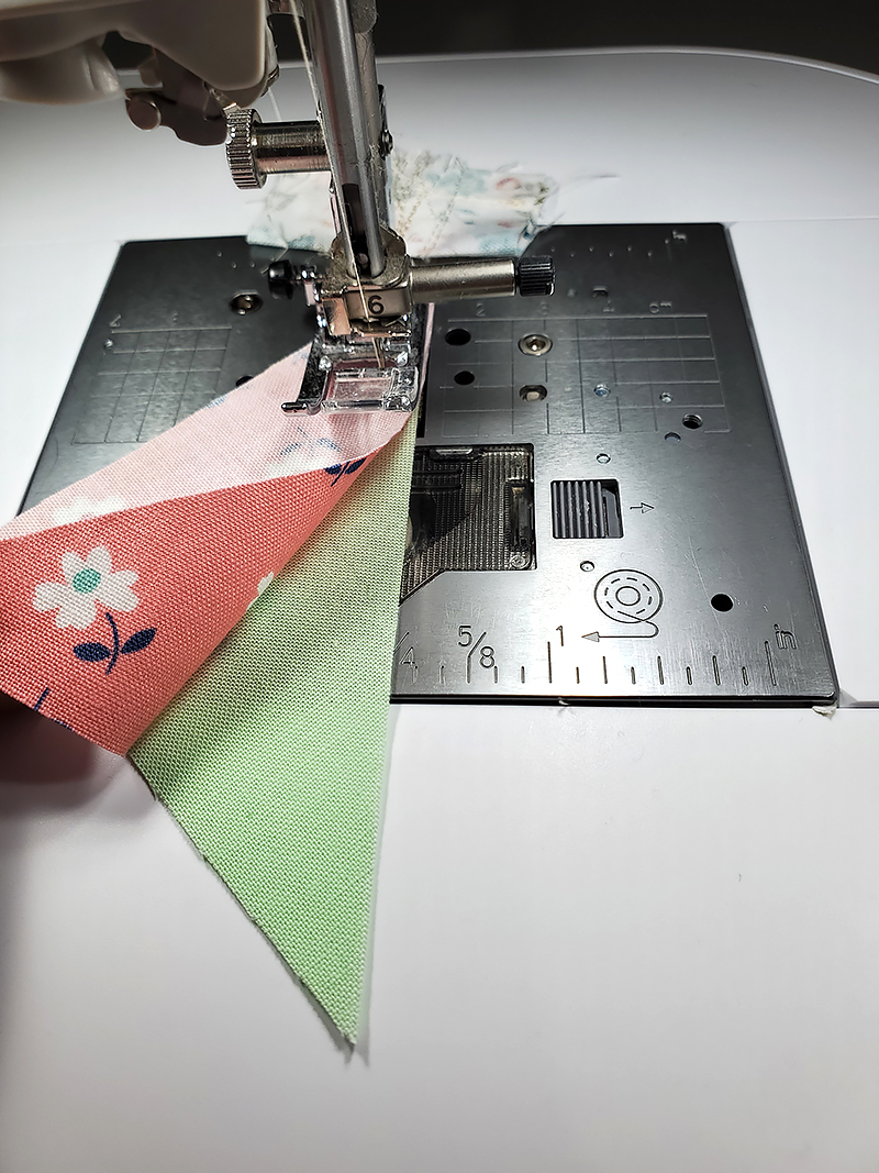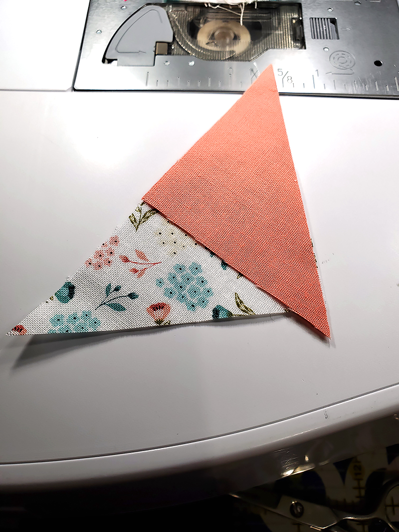 1. Matching RST, stitch piece “Q” to piece “X” on one short side. MAKE SURE that when the stitched piece is opened (and the point is facing up), the floral fabric is on the LEFT. Press seam toward the darkest fabric.