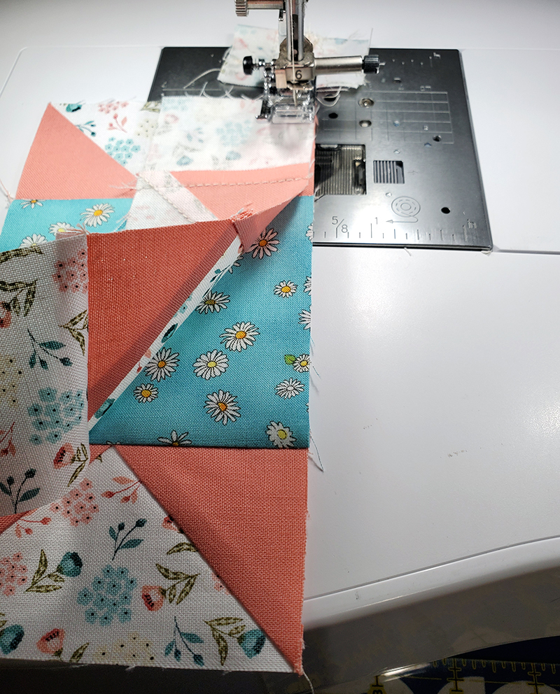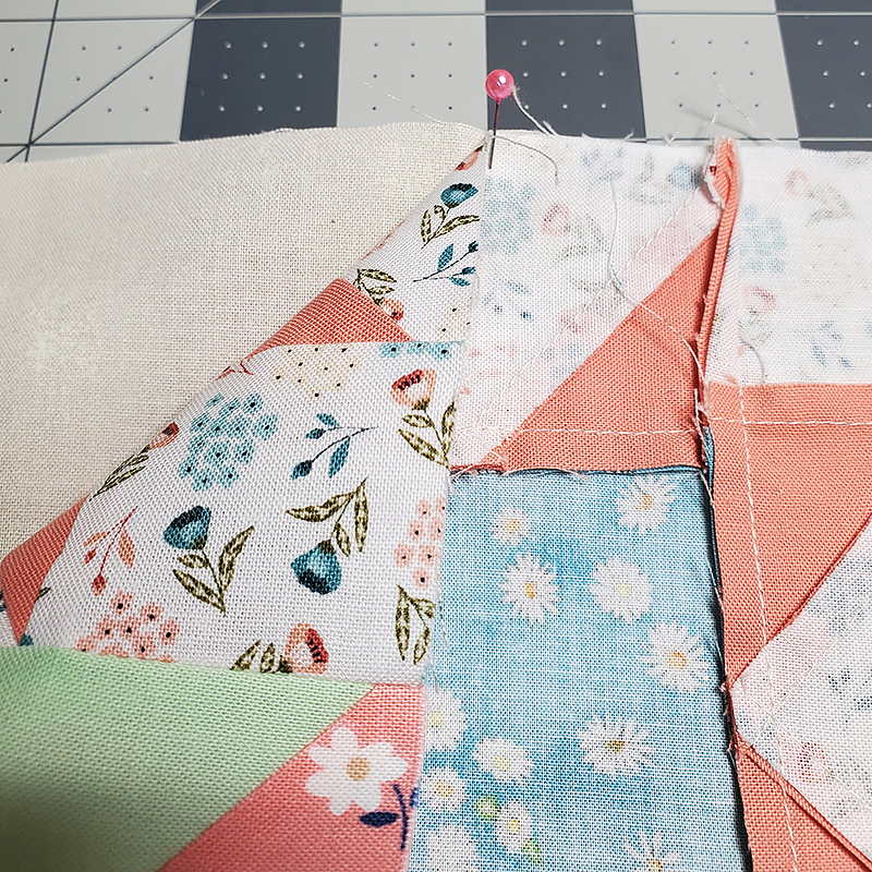 11. Sew one of the units from Step Six to the unit made in Step Nine, nesting seams. Press seam toward center.