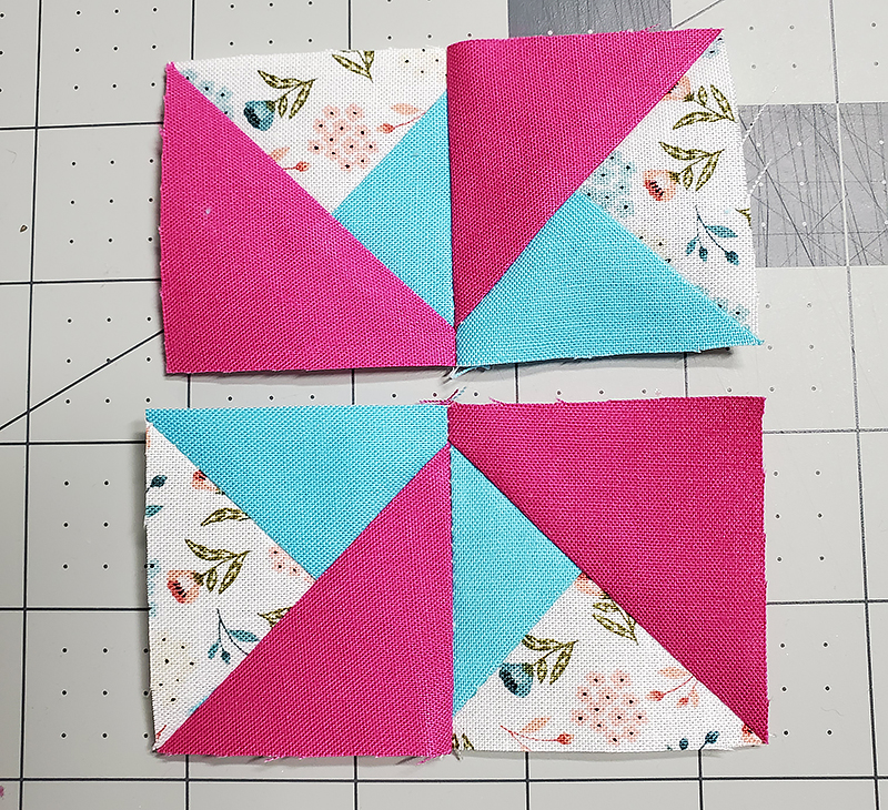 2. Press ½ square triangle unit blocks open. Make TWO units. Each unit should be 3” square. Trim to size if needed.