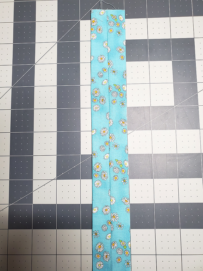 2. Fold over one long edge of piece “D” ¼” and press. Fold over the same edge ¼” one more time and press. Set aside.
