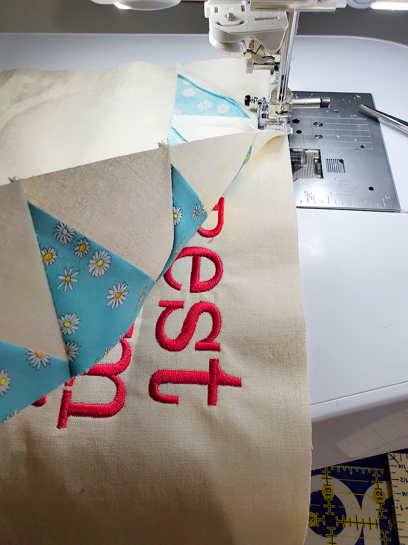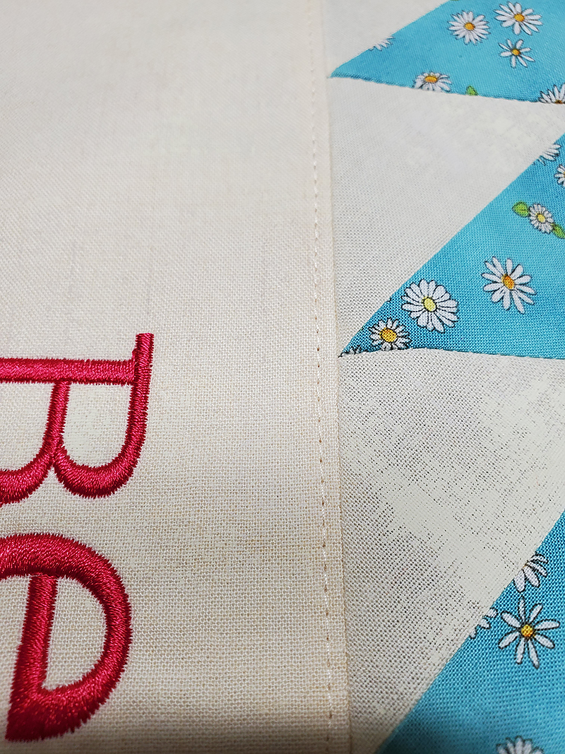 5. Press seam toward embroidered panel and topstitch.