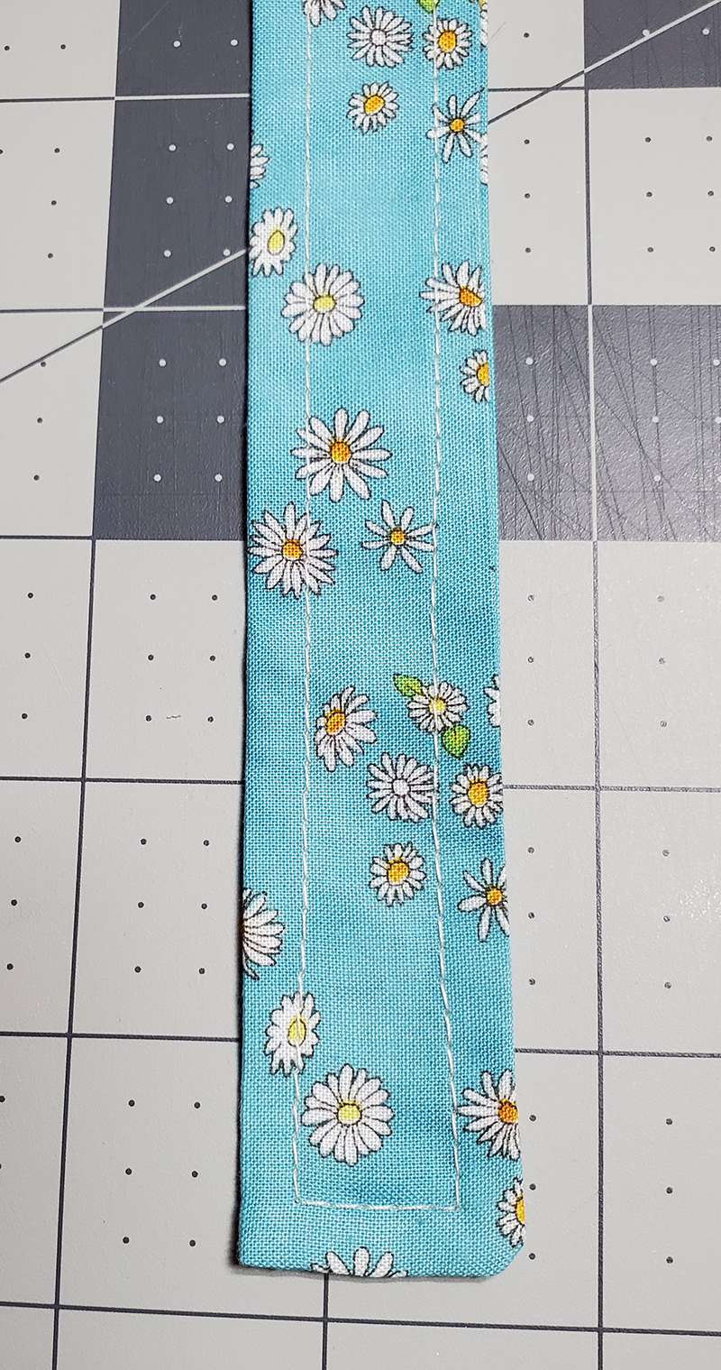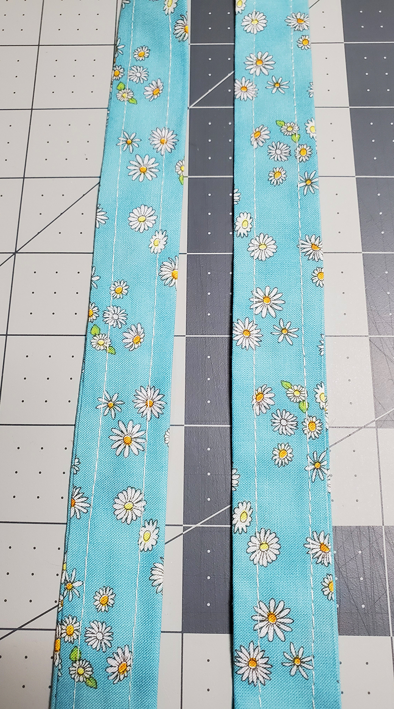 3. Turn the ties Right Side out and press. 4. Topstitch all the way around three sides of both ties for a finished look.