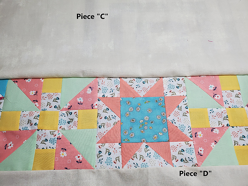 15. When finished and the seams are opened, the row of quilt blocks should be between piece “C” and piece “D.”