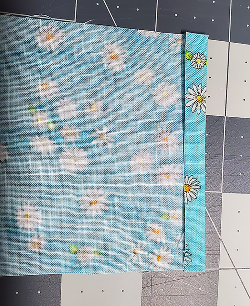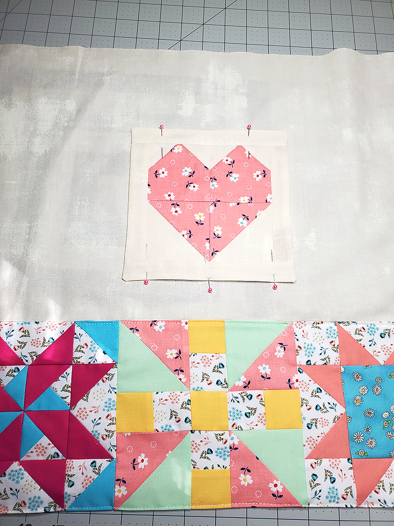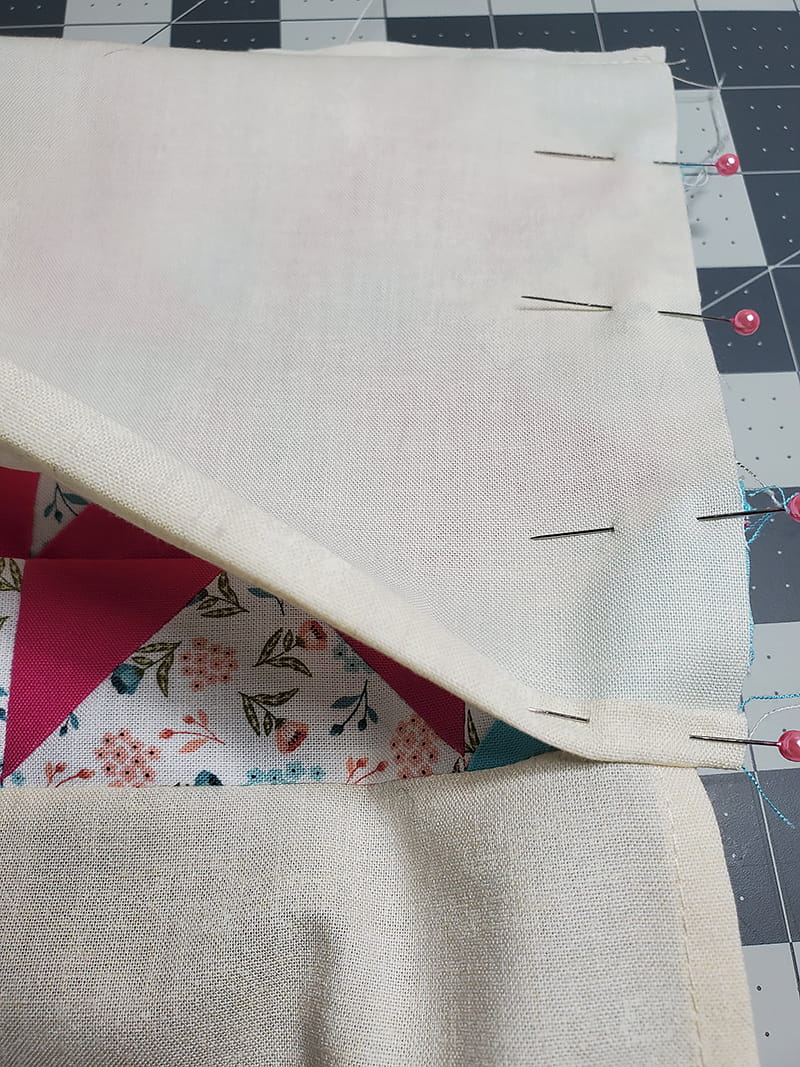 17. Fold piece “D” up over the top of the quilt blocks and pin along two short sides.