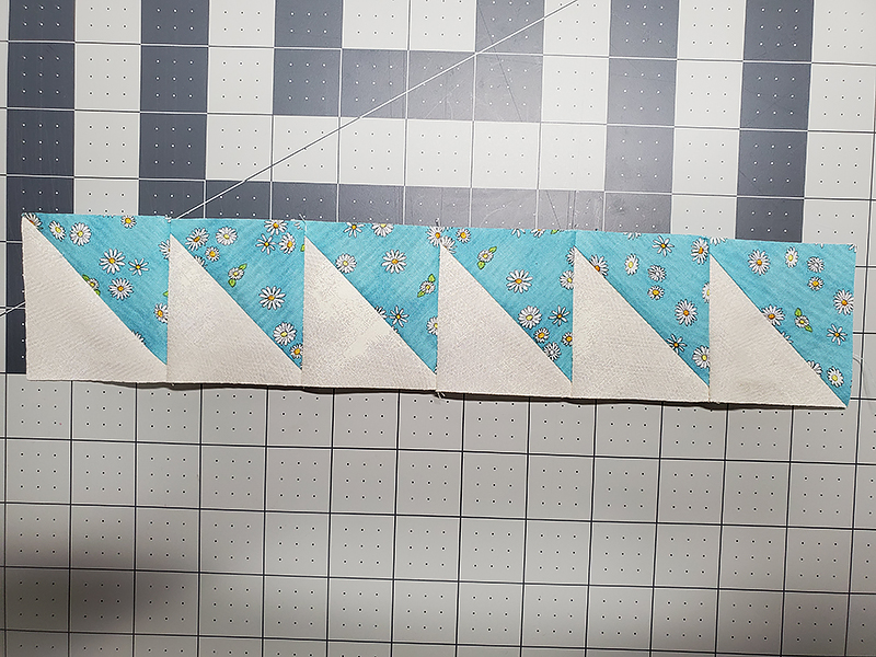 6. Sew six of the ½ square triangles together to construct the top border of your apron bib.