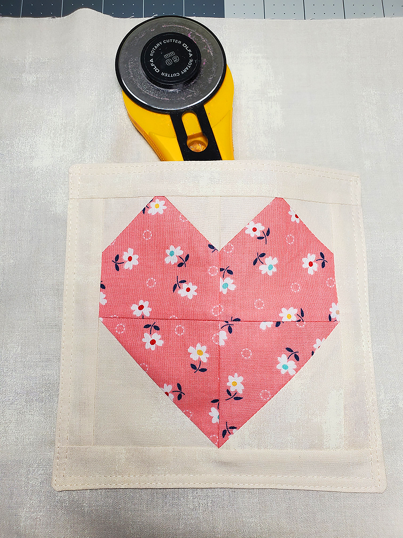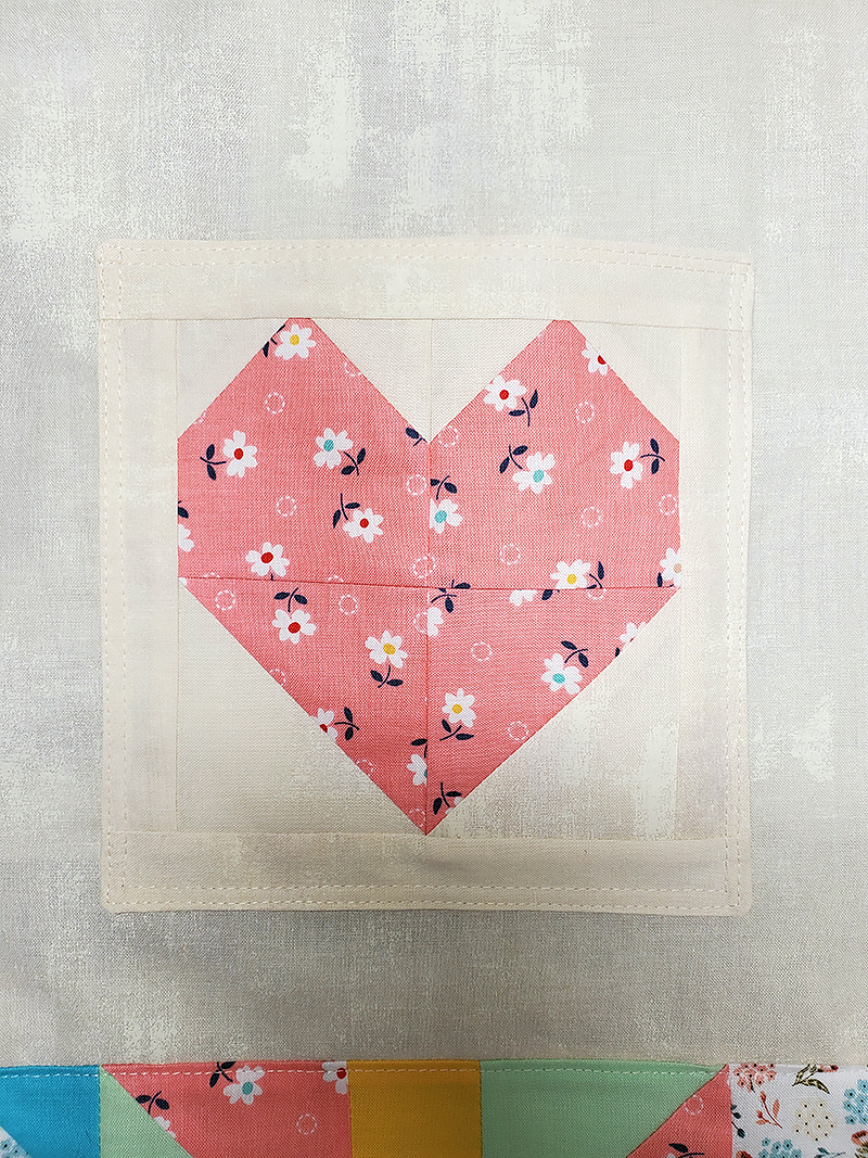 11. Stitch one rectangle “J” to the TOP of the heart block and press the seam toward the outside. Repeat this process sewing the remaining “J” rectangle to the BOTTOM of the heart block.