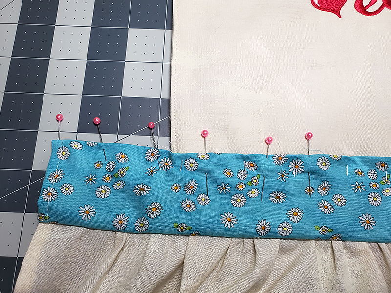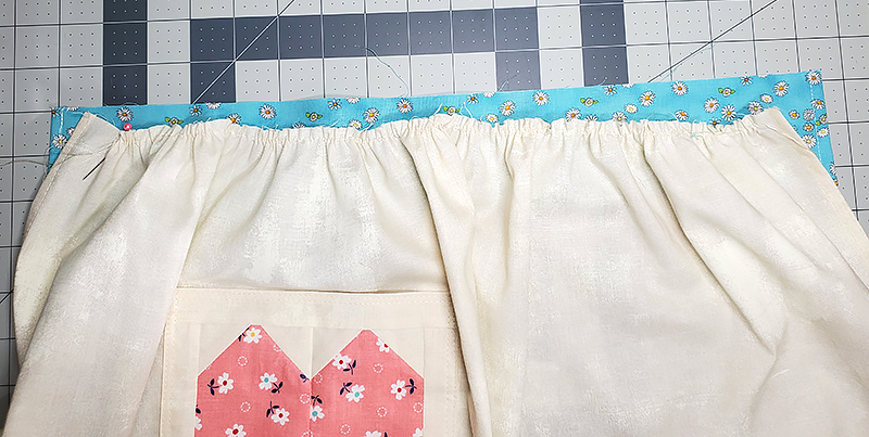 23. Position the Heart pocket on the front of your apron skirt lined up with the second quilt block from the edge and approximately 1 ½” from the top of row of quilt blocks. Pin in place.