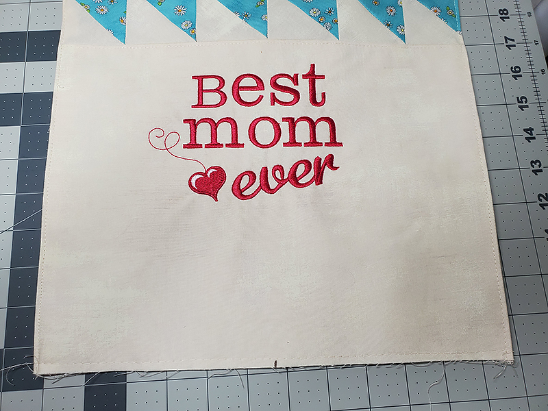 6. Once design is finished embroidering, remove from hoop and press. Cut embroidered fabric to 12 ½” wide and 8 ¼” high, positioning the embroidery approximately 1” from the top as well as centering the design horizontally.