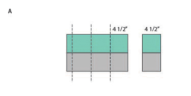 - Pair a 19" gray strip with each aqua strip. Sew together along one long edge to make two strip sets. Press the seam allowances to one side. From each strip set, cut four pieces, 4 1/2" wide (eight pieces total).