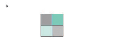 - Join a segment from the first aqua/grey strip set to a segment from the second strip set, alternating the positions of the gray sections. Sew the segments together, matching the seam lines, to make a four-patch block containing four different fabrics; make four.