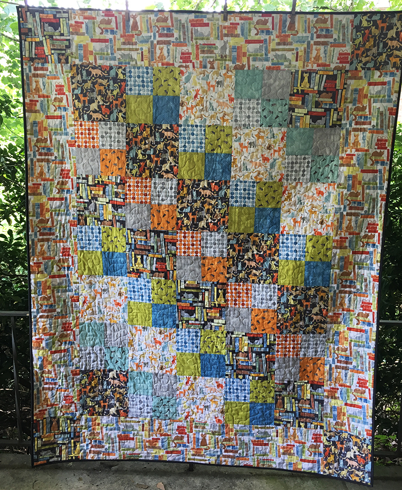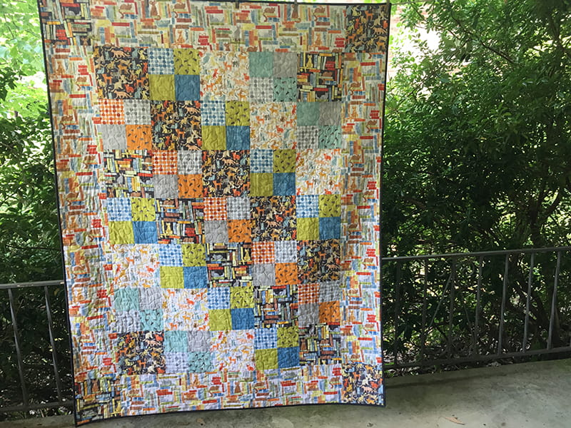 Have you fallen in love with a big, lively print and then not quite know what to do with it? The print gets lost when it's cut into small pieces! This easy quilt is a perfect answer. The blocks are relatively large, but the lap-size quilt doesn't take a lot of fabric. The border provides wide open space for the print to shine, and one-way prints work for both blocks and border. Cutting and piecing are fast, and when the piecing is done, you have a great canvas for quilted patterns from Dream Motion Pro