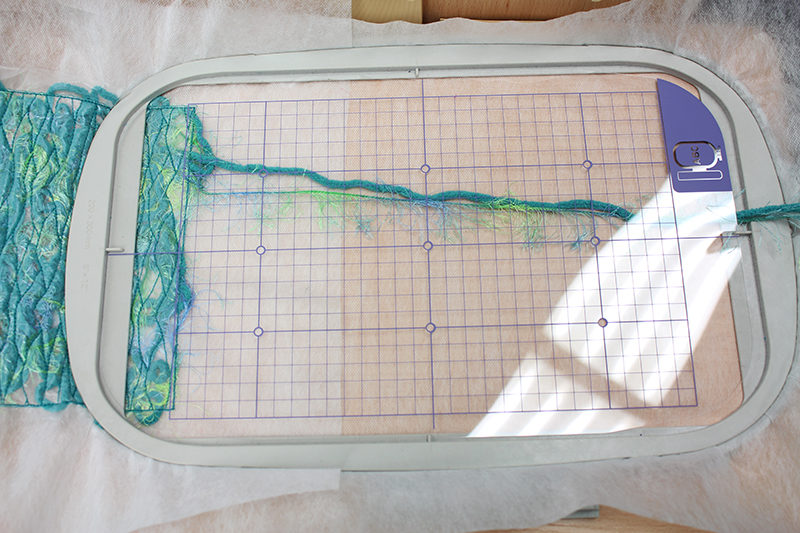 - When the embroidery is finished, remove the stabilizer and embroidered yarn from the hoop. Do not cut or wash-away the stabilizer yet, instead treat the entire piece like fabric.