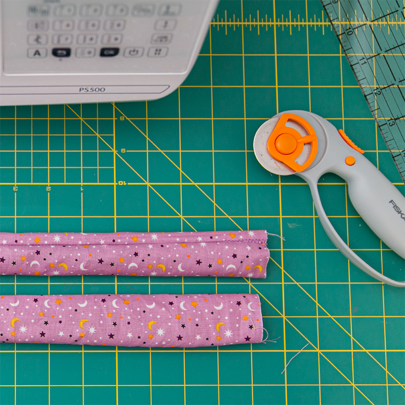 Fold each strap in half lengthwise with the right side facing out and press. Unfold, then fold again. This time, press the raw edges in towards the center. Fold in half along the original crease and topstitch both sides of the strap ¼” in from the edge.