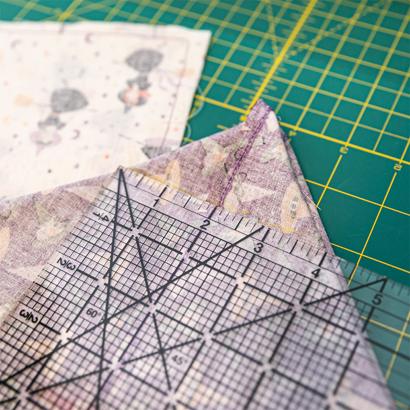 Pull one corner of the outer bag out and flatten it so that the bottom seam aligns with the side seam, forming a triangle. Measure 4” across the triangle and draw a line. Stitch along the marked line, then trim the excess fabric, leaving a ¼" seam allowance. Repeat this process for the remaining corners on the outer bag and lining.