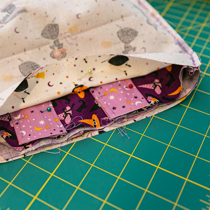 Turn the outer bag right side out. Mark 4¾” from each side seam along the top of the bag. Mark the front and back of the bag. On the front of the bag, align one strap with the marks, ensuring the inside edges of the strap align with the marks. Baste the strap in place and repeat to add a strap to the back.