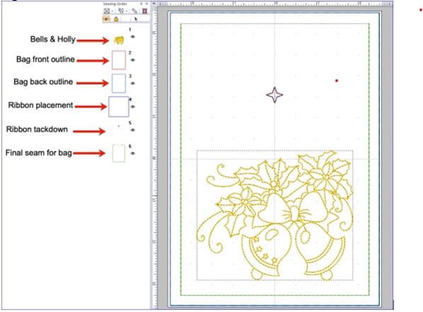 2. Transfer designs to your machine. Create a combination design beginning with the free bells and holly design, then add the in-the-hoop bag design. Move the bells and holly design so it will stitch near the bottom of the green rectangle. See combination design layout in Figure #2.