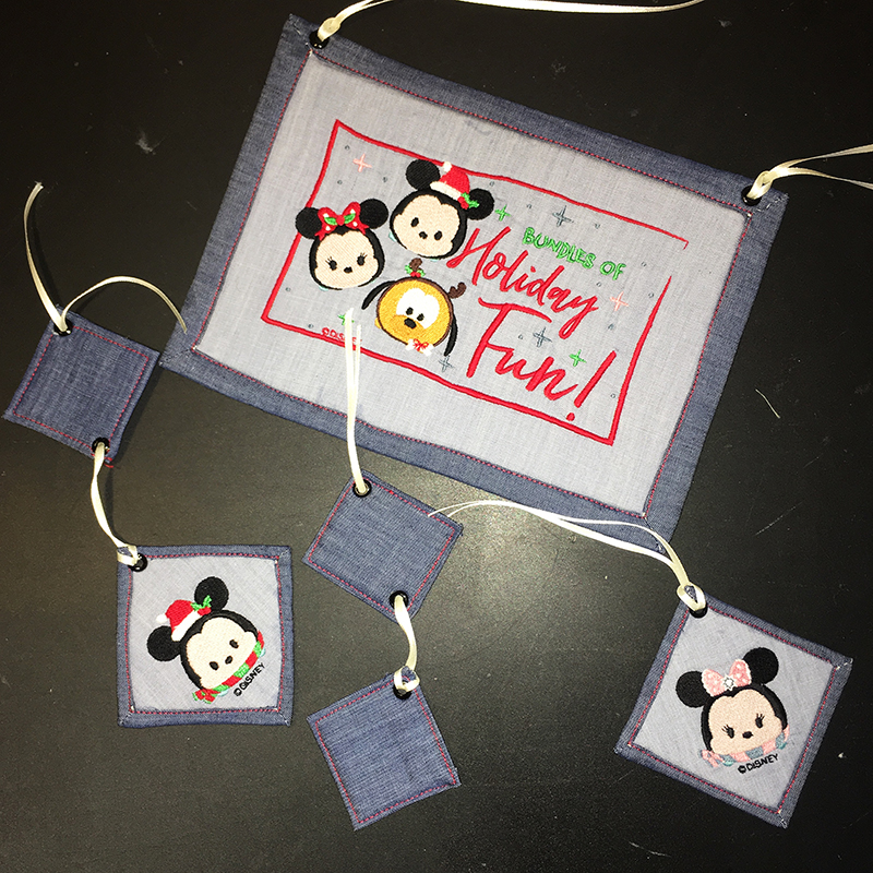 While I love machine embroidery, I honestly forget that Felicia can do it until I’m alerted to a design that is entirely in my wheelhouse. This totally happened when I was shown the new Disney Tsum Tsum Holiday Designs. I had no idea what I was going to make with them, but I knew that I had to play with them and I knew it was going to be super cute whatever it was. So, I went to iBroidery.com, ordered the designs easy breezy, and was ready to embark on my embroidery journey. Enter this Disney Tsum Tsum Decorative Hanging.