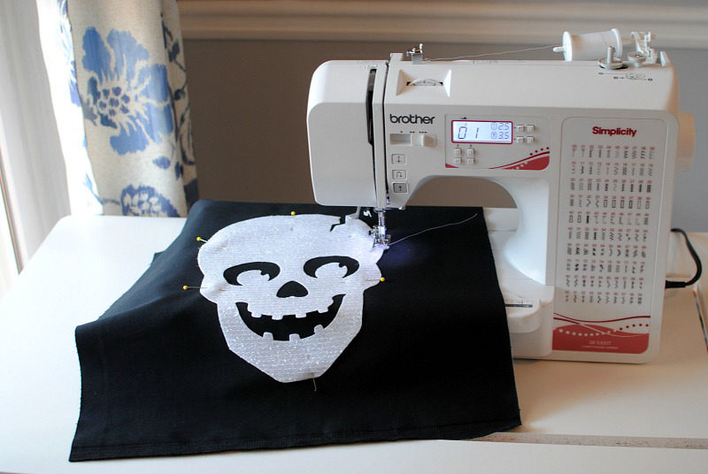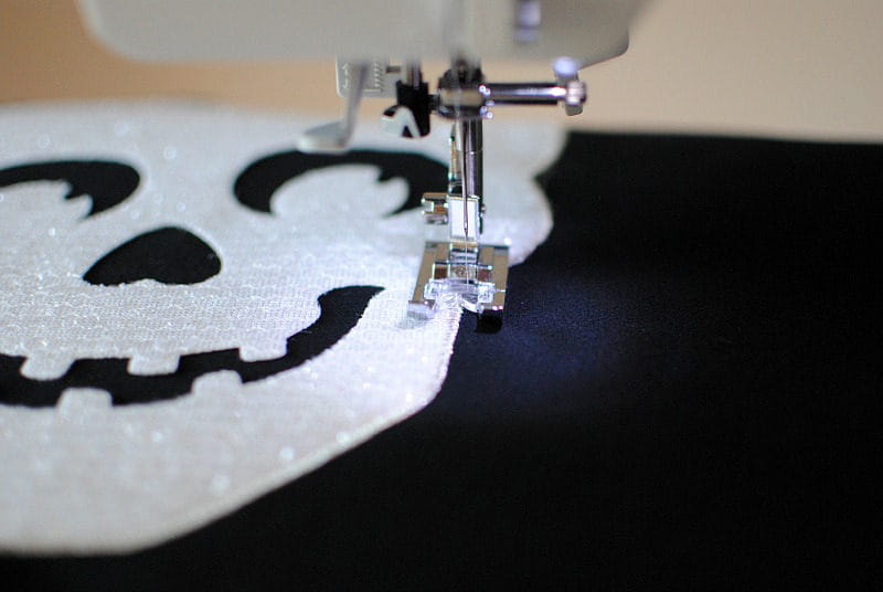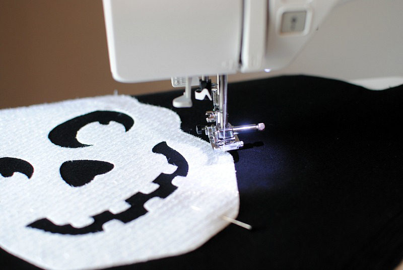 Sew around the perimeter of the appliqué. I also did this around the openings of the eyes and nose. For the mouth, I simply used a straight stitch, but you could also use a satin stitch.