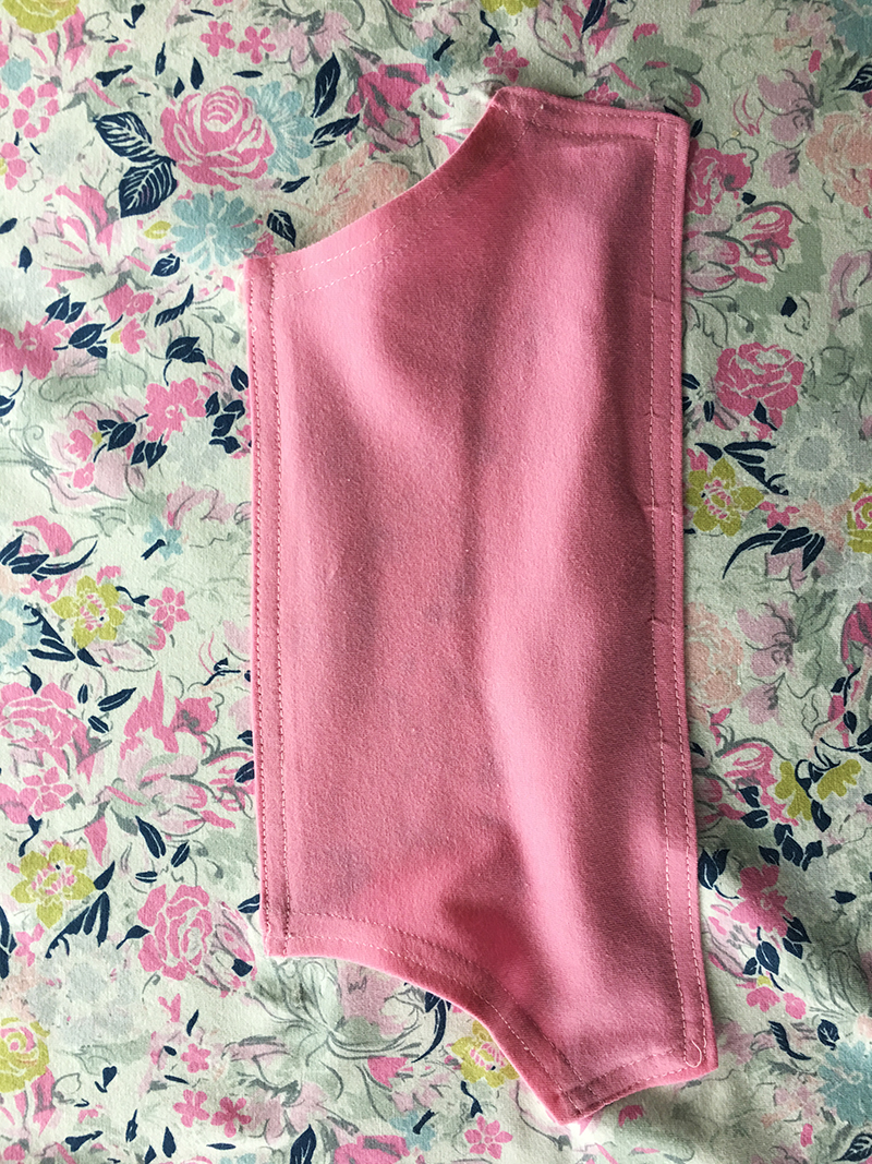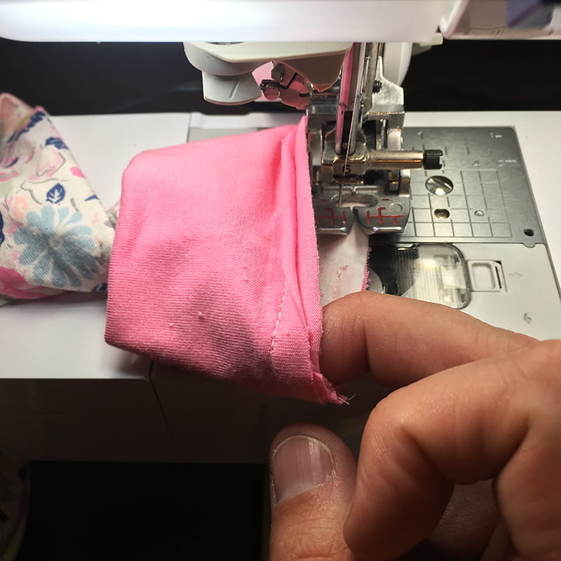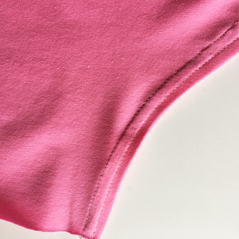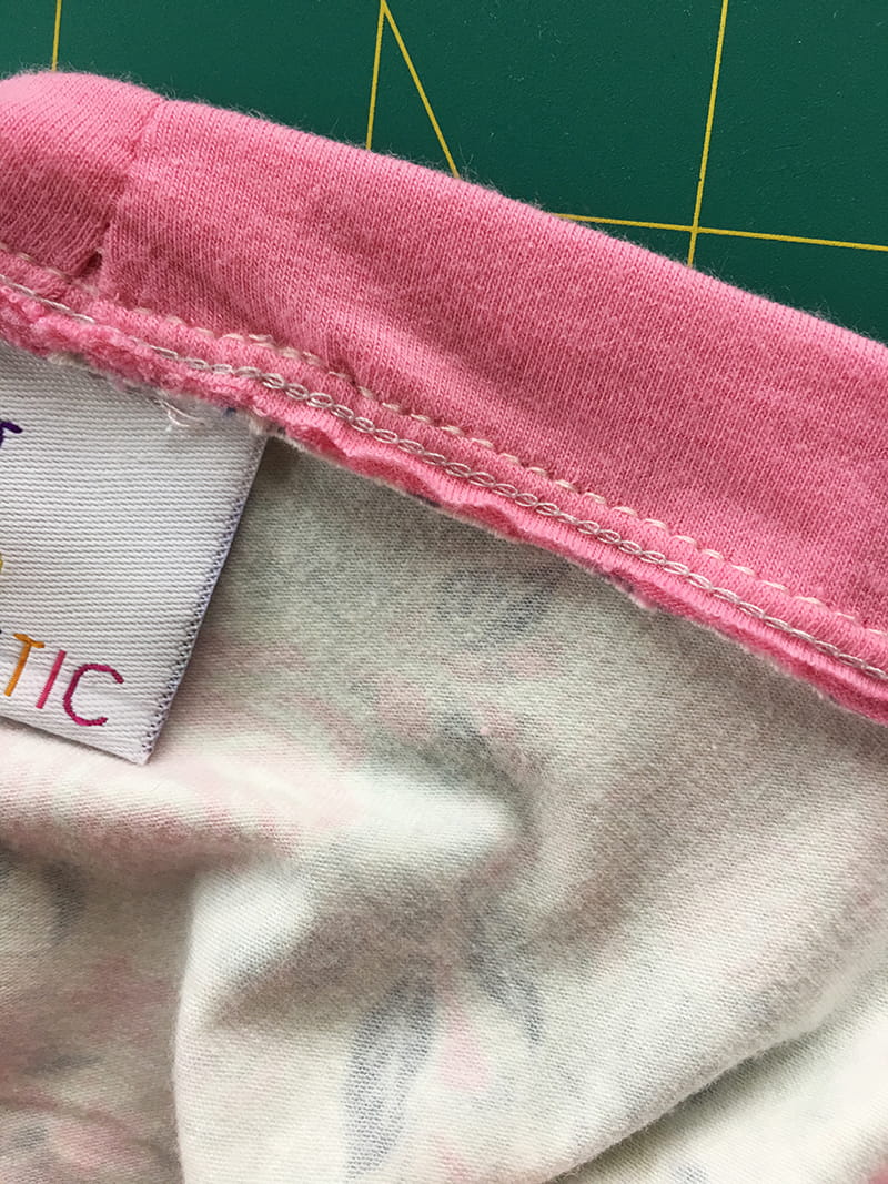 Next, use an iron with the steam off to fold over and set the curved part of the pocket. I find that if you press without steam on knit that the folds don't open back up. And this is when I got to use Britneyan did a wide cover stitch, which uses two needles and creates magic on the back. Check it out below.