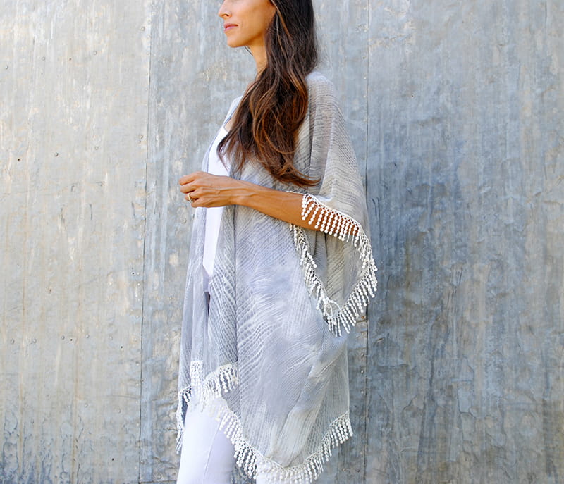 I love the effortless look of a drapey kimono shrug. A versatile piece for all occasions from the pool to an evening cover up it's a wardrobe essential. Lucky for us, it's also an easy project to sew. For this kimono, I went with a chiffon and white fringe trim that I added along the arm openings and the bottom. All you need to sew a kimono is 2 yards of fabric and 3 yards of trim. See the full tutorial below and sew your own kimono shrug.