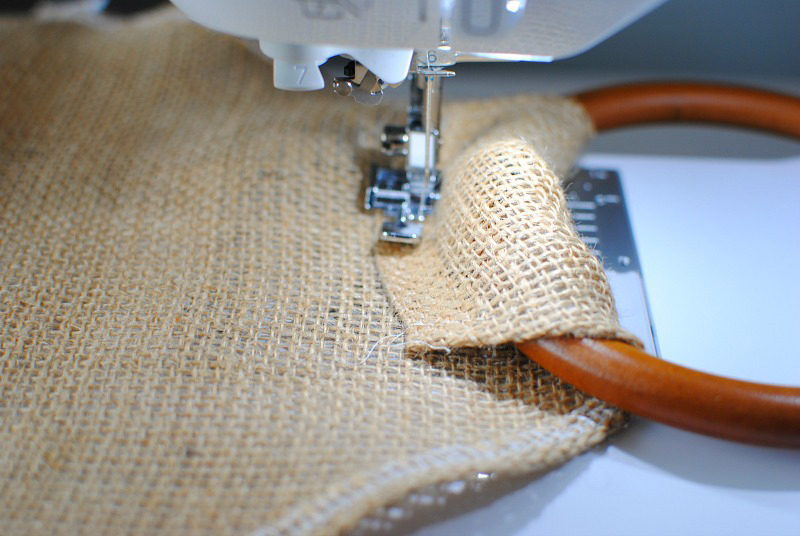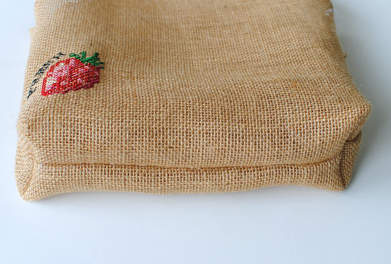 Burlap frays a lot so serge the edges (don’t cut just serge along the edge) after cutting. If you don’t have a serger, use Double Fold Bias Tape (.25” wide) to sew over the seam allowance once sewn together. Just be extra careful when handling if you chose to do embroidery.