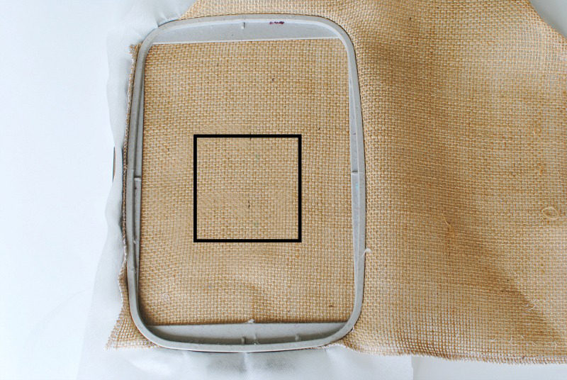 Since the burlap is semi sheer, I am using a water-soluble stabilizer. Hoop the stabilizer and the burlap. You can also float the burlap if you can’t get the edges in nice and tight.