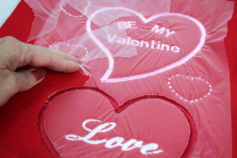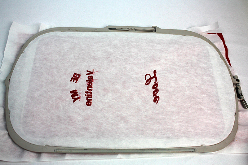 - Tearaway the excess water-soluble stabilizer off the top. Rinse away any stabilizer stuck in between letter or designs.