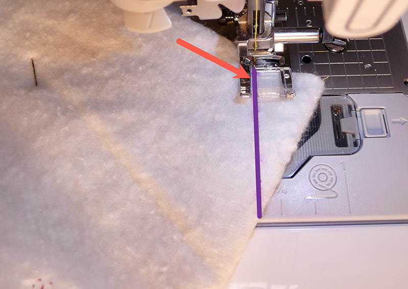 Sewing the darts: We’re not sewing darts in a garment, so it’s okay to backstitch at both the wide opening and the point. With the needle in the leftmost position, you can follow the inside opening of presser foot “J” along the line for accurate stitching. See the enhanced photo in Figure #10, with the red arrow pointing to the opening in the foot and the purple line indicating the dart stitching line.