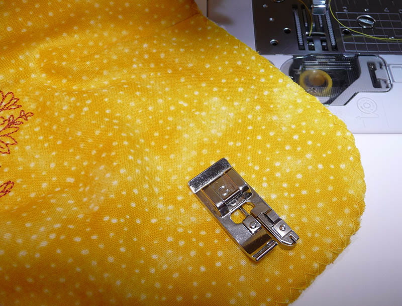 - Prepare to finish bowl. I used foot “G” and a zig-zag stitch set for width 5.0, length 3.5 to overcast the edges of the inner bowl fabric, securing fabric and batting layers together to make sewing the narrow seam easier. This foot makes it easy to follow along the raw edge, with overcasting skimming raw edge of fabric layers. See Figure #12a and Figure #12b.