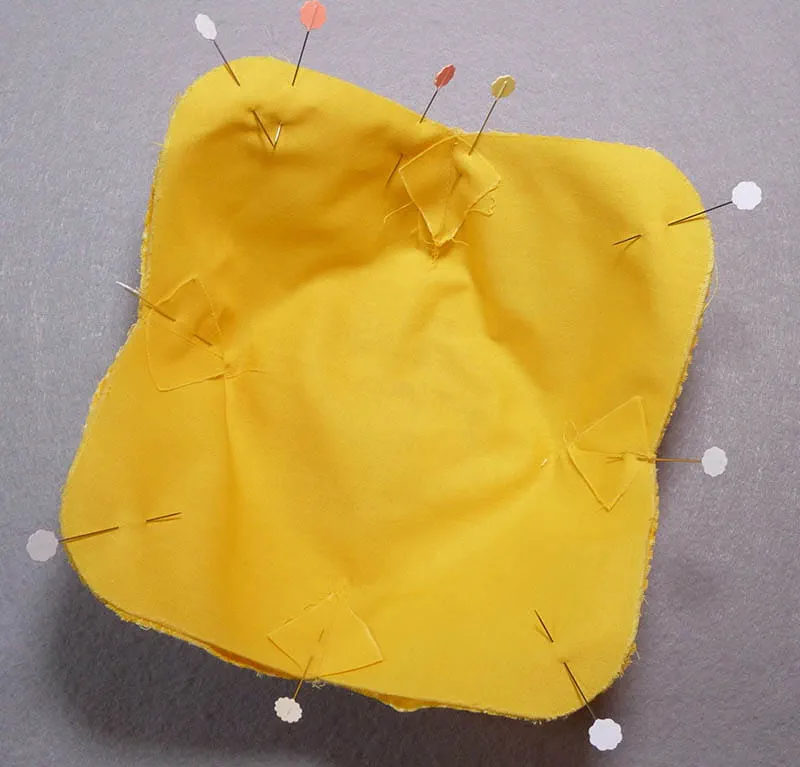 Layer and pin piece #1 and piece #2 together, with right sides facing and darts matching. Mark off an opening measuring 2 ½-inches along one straight side for turning right side out. See Figure #13 with two orange-colored pins marking opening.