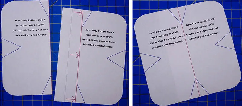 - Download design and transfer to your machine. Print pattern piece A and B. Trim pattern pieces along black lines and tape together as noted on pattern. Tip: Trim away excess paper beyond red line on Pattern Side A, and then overlap with Pattern Side B for an easy way to connect the two. You now have a full pattern piece for cutting your fabrics and batting to size. See Figure #2.