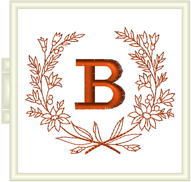 Create a combination design by adding a monogram letter to the center of the wreath design. Adjust position of letter within the wreath as necessary. Tip: While a letter may be perfectly centered, it can look a little “off” depending on the shape, size, and style of the letter itself. I used a basic block style letter, size large, and moved it slightly until it was pleasing to the eye. Tip: you could consider stitching a name or greeting inside the wreath if it will fit. See example of wreath with monogram in Figure #6.