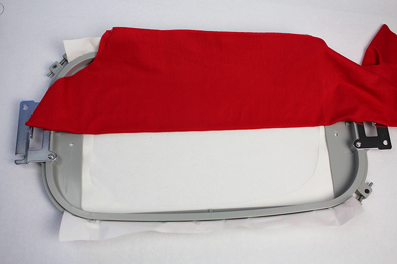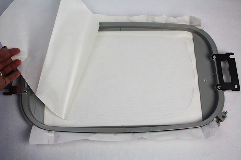 - Hoop the Pacesetter lightweight adhesive-backed water-soluble stabilizer with the paper side up. Score the paper and remove the paper from the center of the hoop.