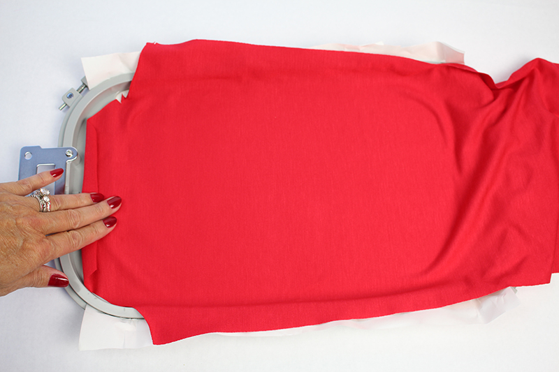 - Lay the sleeve flat on the sticky back stabilizer, being very careful not to stretch the knit. Check the fabric for wrinkles or puckers. (Double check that the right side of the fabric is facing up).