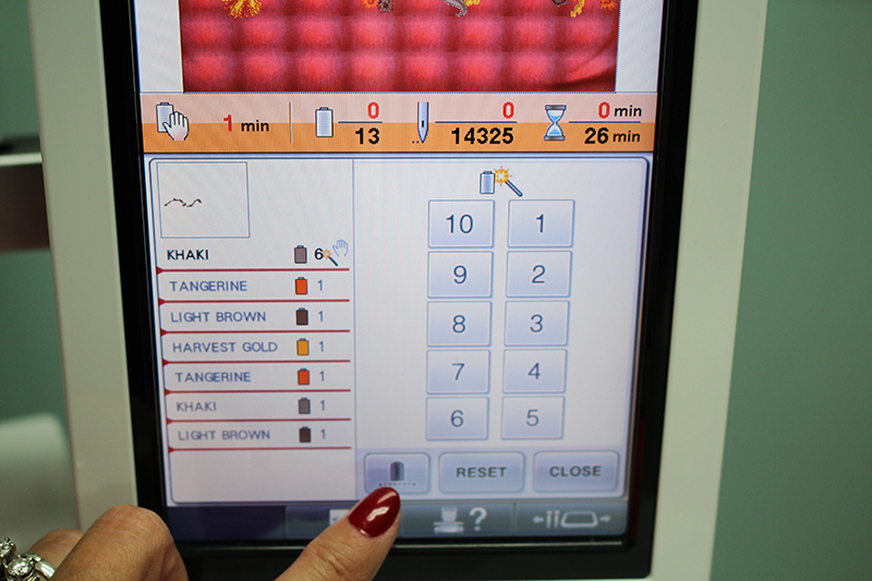 - This will take you to a screen where you have a choice to change each color to coordinate with the spools of thread in your machine or click on the icon my finger is pointing to and this will change all the colors the same.