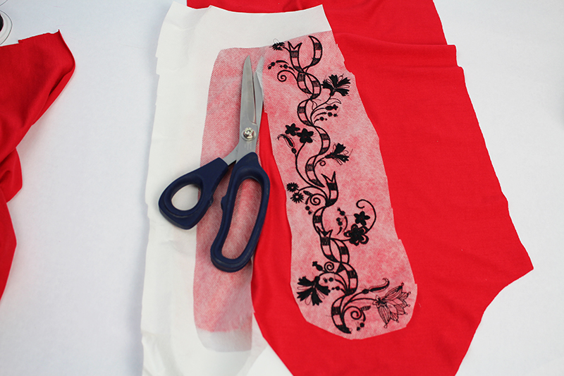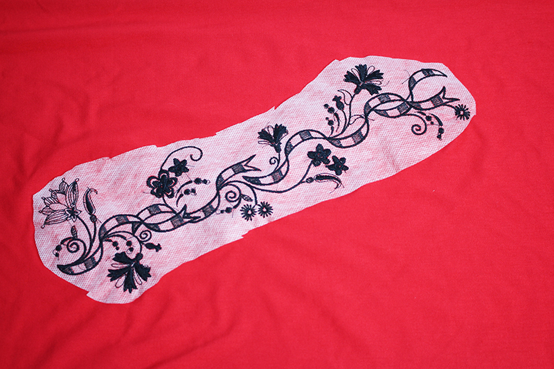- Embroider the first design. When the first design is finished, remove the fabric and stabilizer from the embroidery hoop and cut away any excess stabilizer.