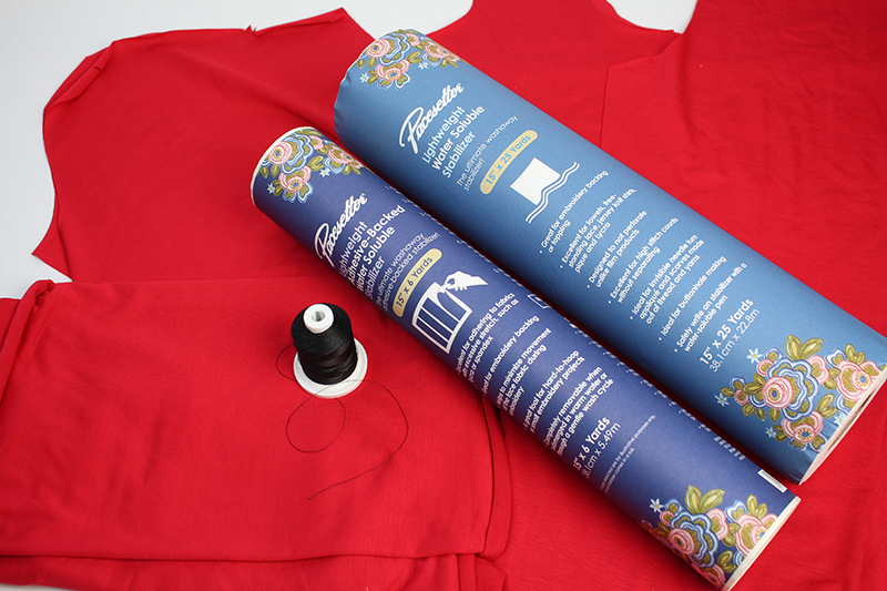 what about knits? Knit tops are my go to for a quick and easy sewing project. The knits I typically use for tops are usually rayon or polyester blends. These fabrics are thinner and tend to be somewhat fragile when it comes to the sewing machine needle piercing the fabric. Here are a few tips for embroidering on a rayon knit: