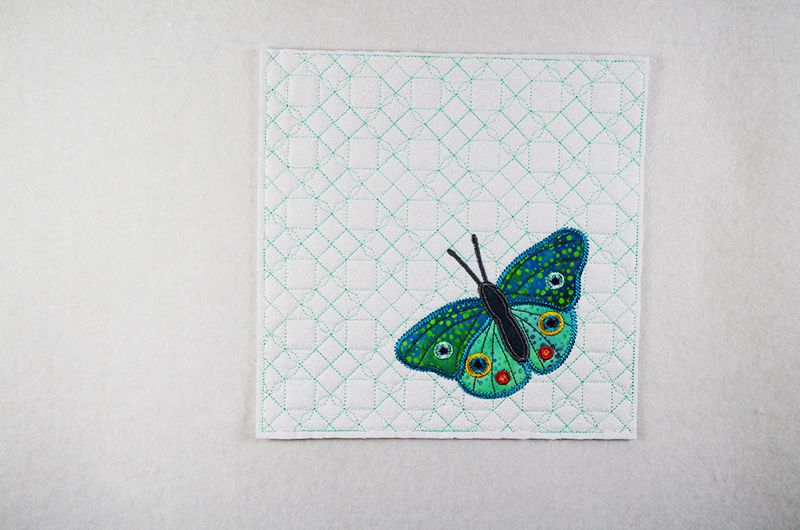 - The appliqué finishes at 16” x 20” which is stitched out in 4 different Parts and aligned with Crosshairs.