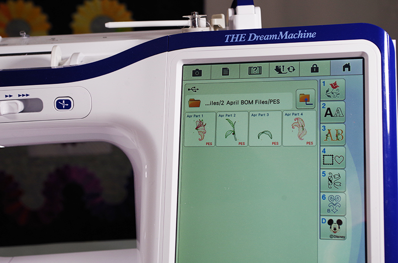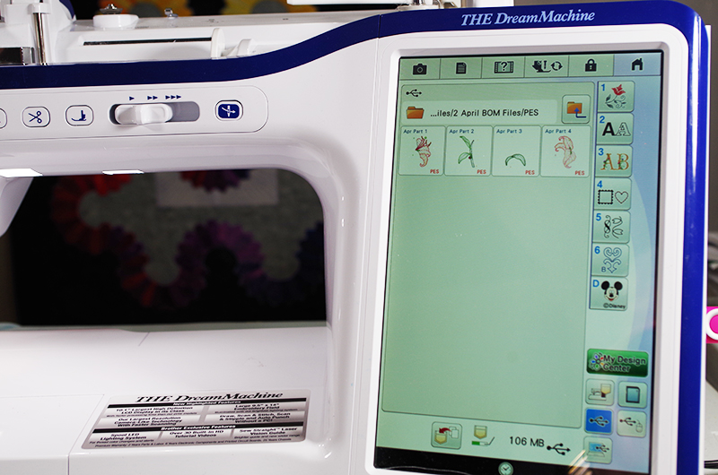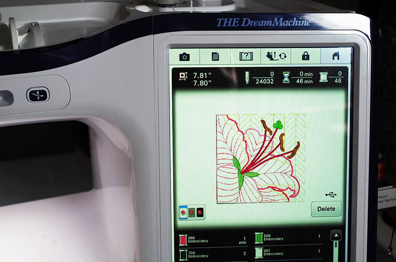I have been often asked how long does it take to stitch out an appliqué design on THE Dream Machine® Innov-ís XV8500D. While there is a time duration on the design when loaded, that is actual stitch time by the embroidery machine. As such, it does not include removing the hoop from the embroidery unit, trimming the appliqué shape or changing thread colors. This does assume that you have already prepared your background and appliqué fabric, as well as selected all your threads, and stabilizer cut to size.