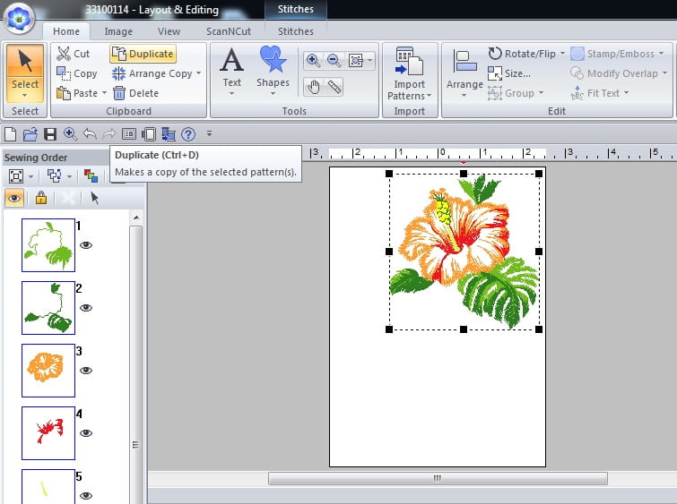 Drag the selected design to the upper right corner of the hoop. Next, click on duplicate to make a second copy. See Figure #4.
