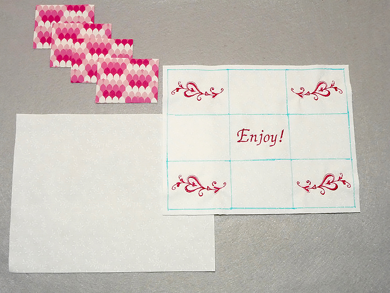 , Premium Pack 1 Upgrade for XP1 and included with XP2. Using this hoop allowed me to stitch all four designs at one time by hooping a piece of fabric measuring 13-inches X 15-inches, centering each design in the four corner blocks. - One piece of matching fabric measuring 8 ½-inches X 10 ½-inches for the back of the snack
