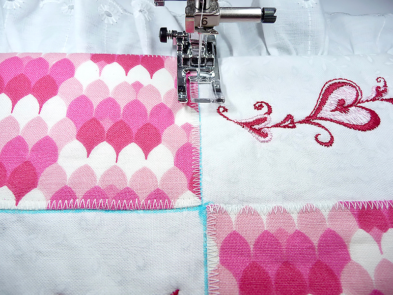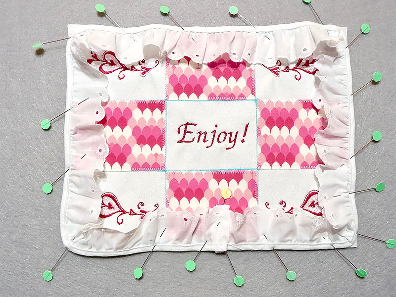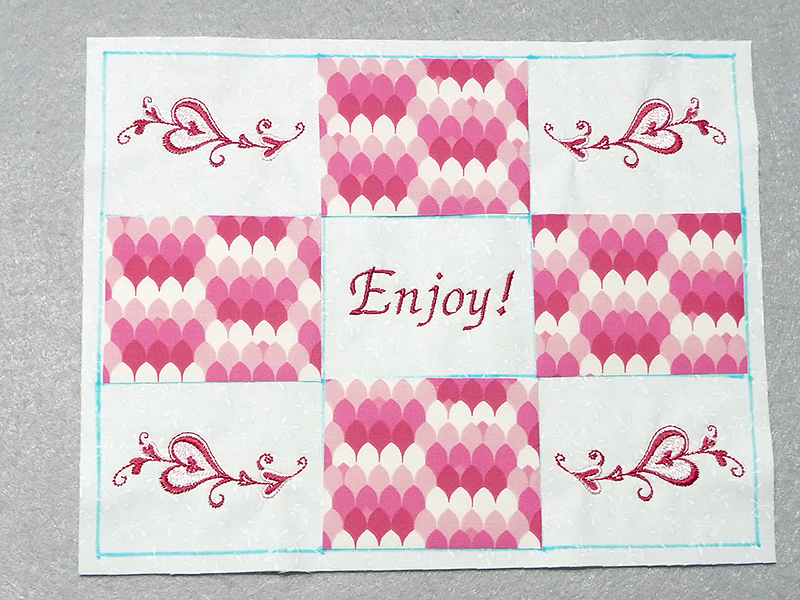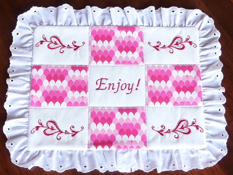 ~Joanne Banko, Brother Sews Ambassador What exactly is a snack mat, you ask? I would say that it’s a cross between a placemat and a mug rug. The 8-inch X 10-inch size is simply perfect for a little “me time” with a beverage and a snack. Use the Brother free design of the month fancy heart design to create this fun and colorful snack mat. This project makes a wonderful gift for friends and loved ones. Are you ready? Let’s go sew!